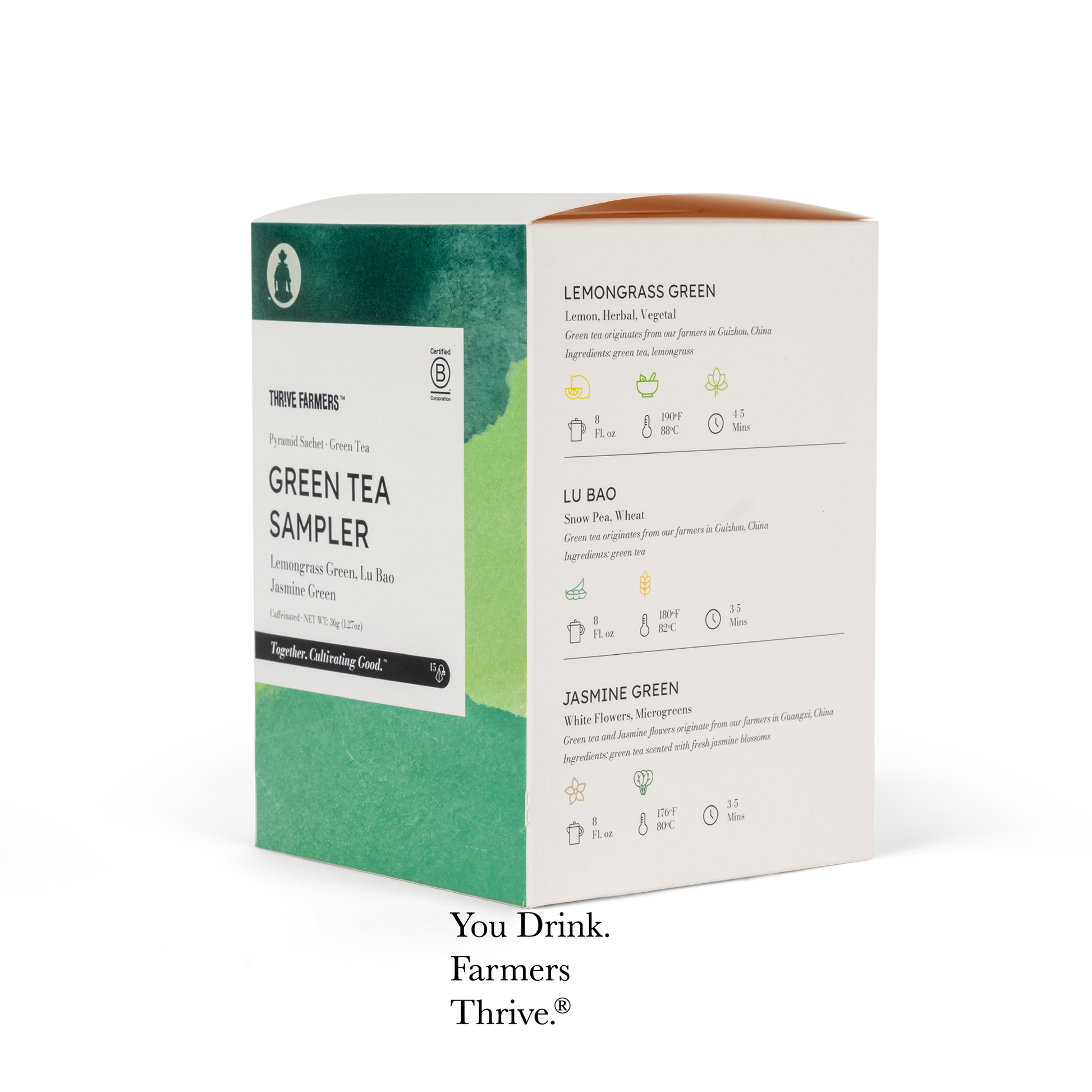 Lemongrass Green: 8 fl oz, 190° F/88° C for 4-5 minutes Lu Bao: 8 fl oz, 180° F/82° C for 3-5 minutes Jasmine Green: 8 fl oz, 170° F/80° C for 3-5 minutesSERVING INFO
