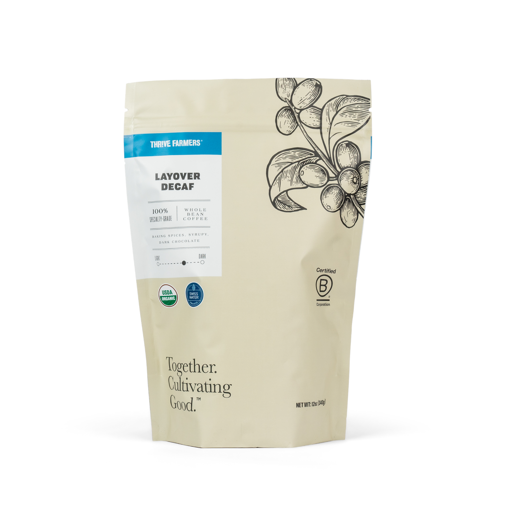 Thrive only uses the Swiss Water Process to decaffeinate our specialty coffee. Swiss Water Process is a chemical-free, environmentally friendly process that preserves the character of the bean and is 99.9% caffeine-free. This year's Layover blend features a single origin from Huehuetenango, Guatemala. Layover is candy sweet with a bright, fruit-forward acidity, balanced perfectly by a medium to dark roast profile.